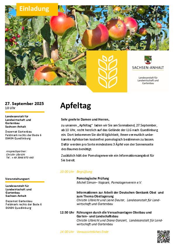 (29.09.2025/ Quedlinburg) Viele Besucherinnen und Besucher nutzten in diesem Jahr die Gelegenheit, den Apfeltag des Dezernat Gartenbau der LLG am Standort Quedlinburg zu besuchen. Viele brachten ihre Äpfel und Birnen mit, um diese von Fachleuten bestimmen zu lassen."Trotz teilweise längerer Wartezeiten herrschte eine lebendige und interessierte Atmosphäre. Die Gäste informierten sich über verschiedene Apfelsorten, probierten frisch gepressten Apfel- und Birnensaft und erhielten spannende Einblicke in die aktuellen Versuchsarbeiten des Dezernats Gartenbau", informiert Christin Ulbricht, Dezernentin Obstbau bei der Landesanstalt für Landwirtschaft und Gartenbau. Der Apfeltag habe somit nicht nur fachliche Informationen geboten, sondern auch ein sinnliches Erlebnis rund um die Vielfalt der Obstsorten ermöglicht. "Ein gelungener Tag für alle Obstliebhaberinnen und Obstliebhaber", resümiert Christin Ulbricht.
