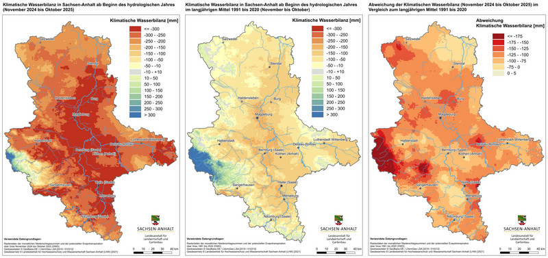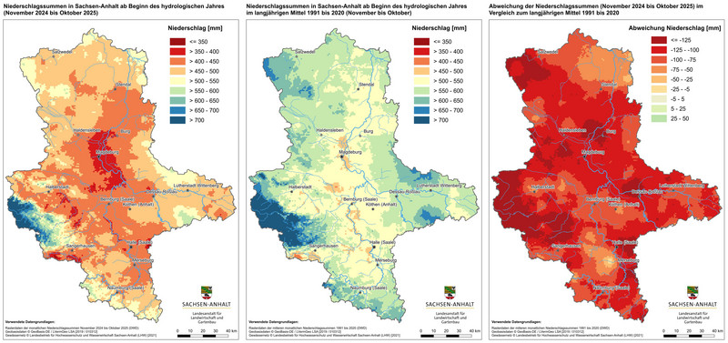 Die Karten zeigen die Niederschlagsmengen und die Klimatische Wasserbilanz für Sachsen-Anhalt seit Beginn des hydrologischen Jahres von November 2024 bis Oktober 2025. Gegenüber gestellt ist jeweils das langjährige Mittel von November bis Oktober in der Referenzperiode 1991 bis 2020. Das hydrologische Jahr (auch als Abflussjahr bezeichnet) weicht vom Kalenderjahr ab. Es beginnt am 1. November und endet am 31. Oktober des Folgejahres. Mit Beginn des hydrologischen Jahres werden in der Regel die pflanzenverfügbaren Wasservorräte für die nachfolgende Vegetationsperiode aufgefüllt. Zudem werden auch die Niederschläge erfasst, die als Schnee gespeichert werden und erst im Frühjahr als Schmelzwasser abflusswirksam sind. Die Klimatische Wasserbilanz wird ermittelt aus der Differenz der Niederschlagsmenge und der Gras-Referenzverdunstung, basierend auf den Auswertungen des Deutschen Wetterdienstes (DWD).